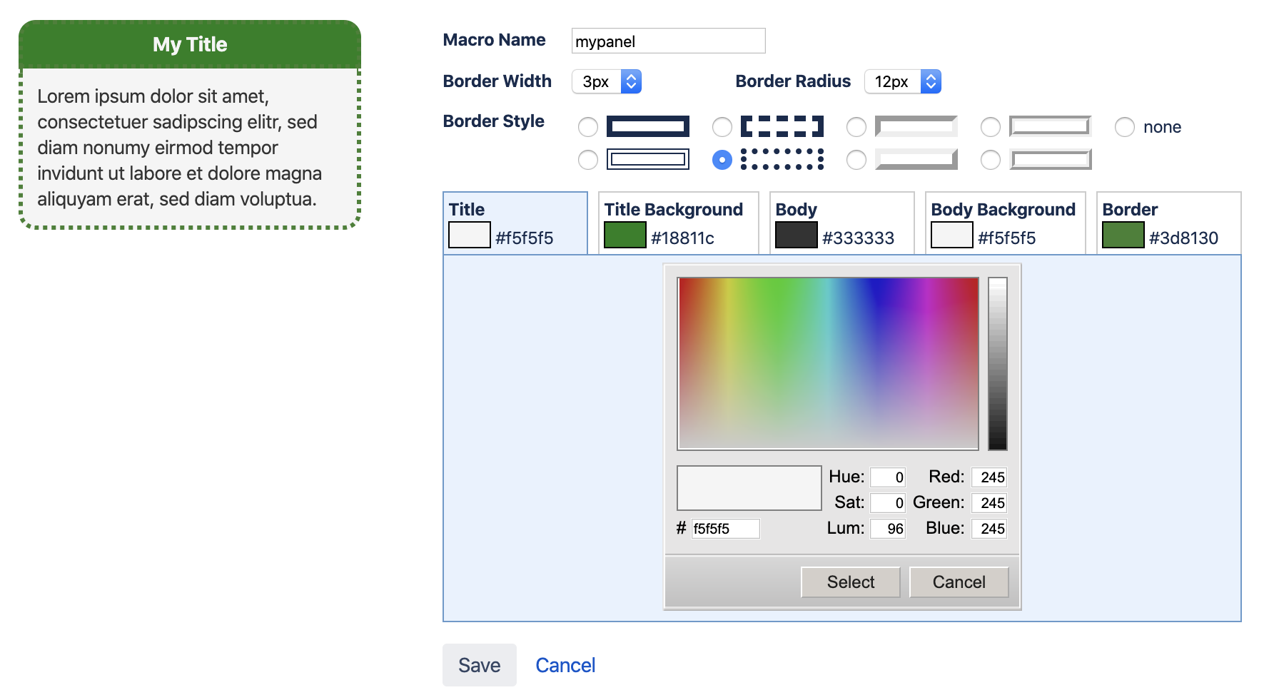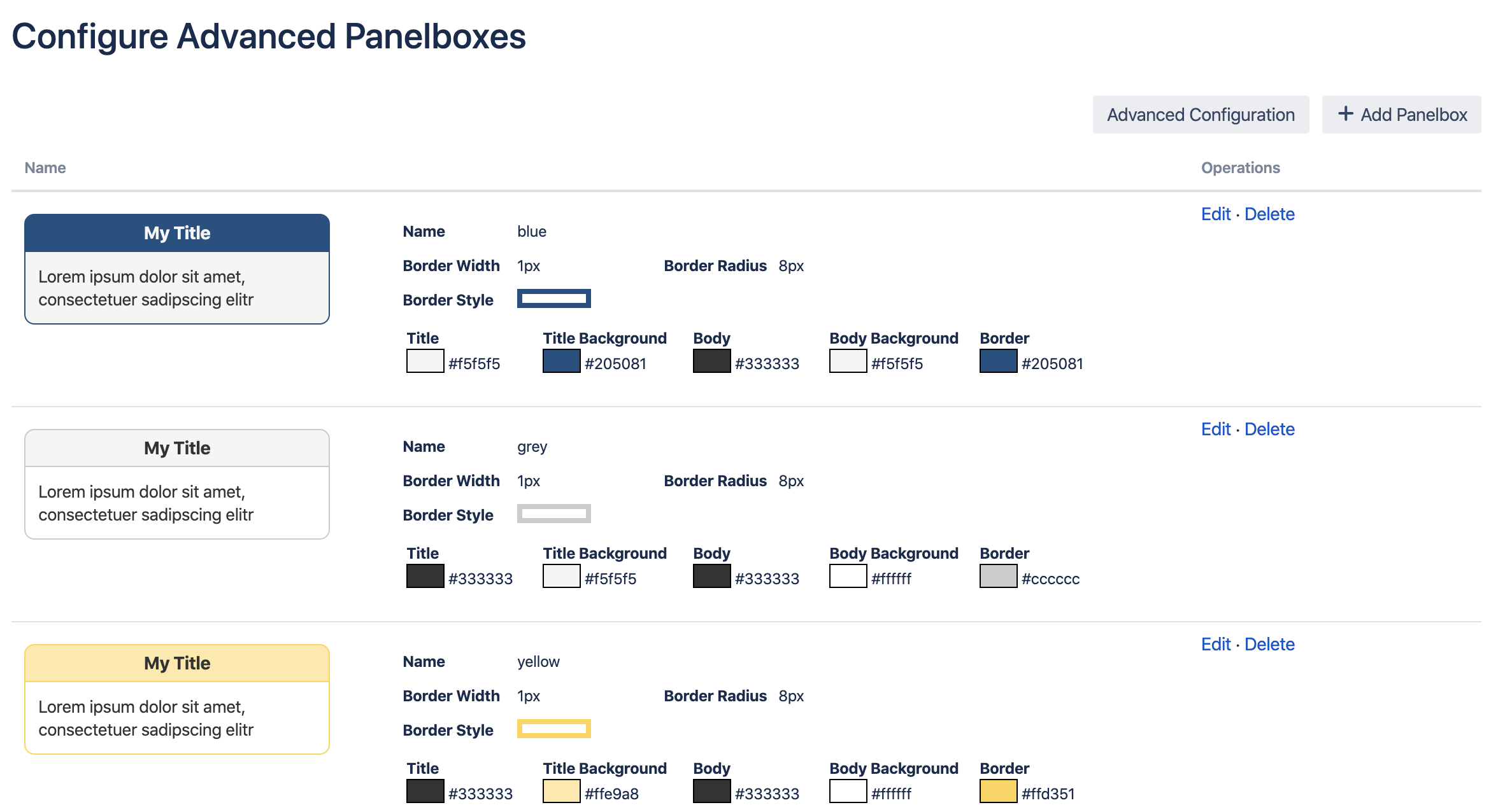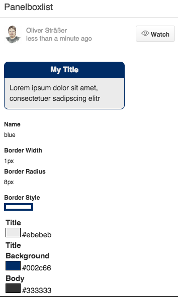 If the style of a Panelbox needs to be changed (for example, when the colour scheme of the corporate design changes), those changes are made once in the app configuration. All the corresponding Panelboxes are changed immediately throughout the whole Confluence instance. No need to edit hundreds of pages!