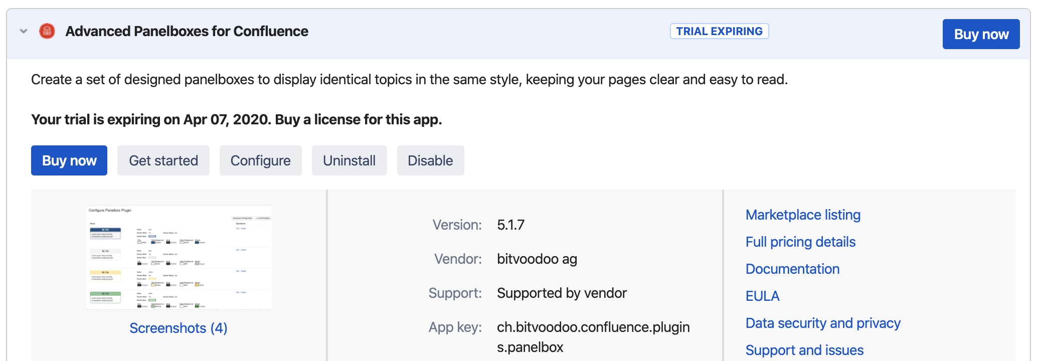 In the app management section, select "Advanced Panelboxes for Confluence" and click on "Configure":