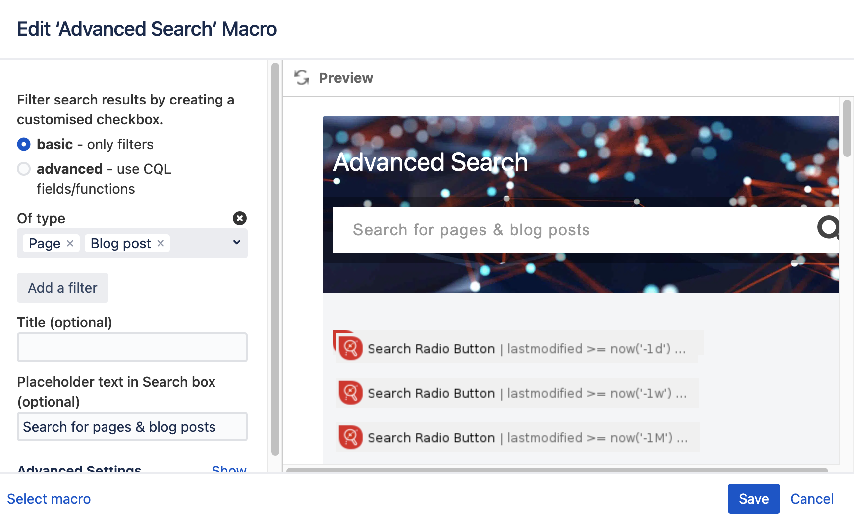 The multiple options of Advanced Search macro and its "children" macros can seem overwhelming at first. That's why we suggest you get started by using one of our templates. They include a number of macros and useful settings. Read all about them here: Getting Started with Advanced Search for Confluence
