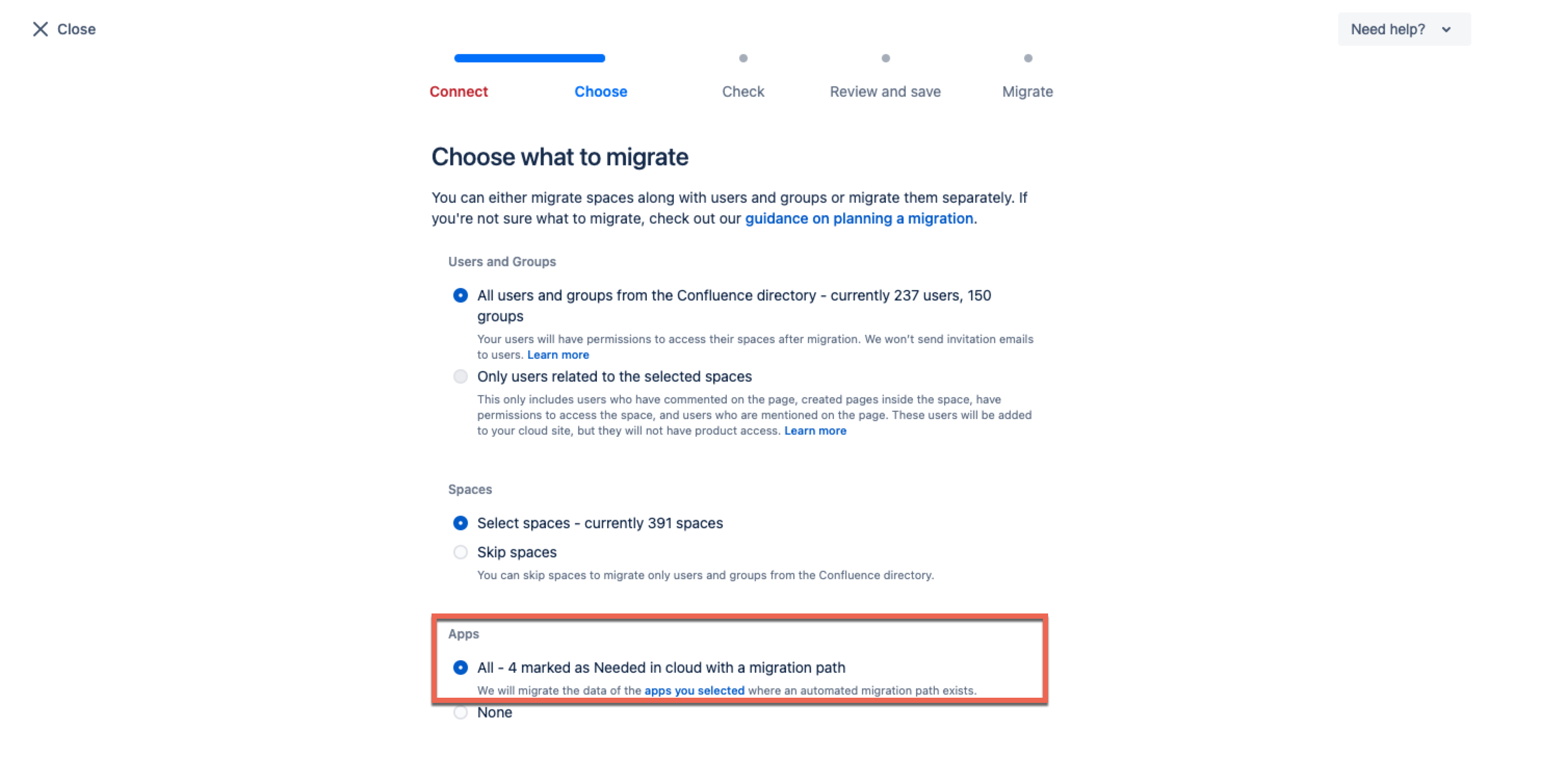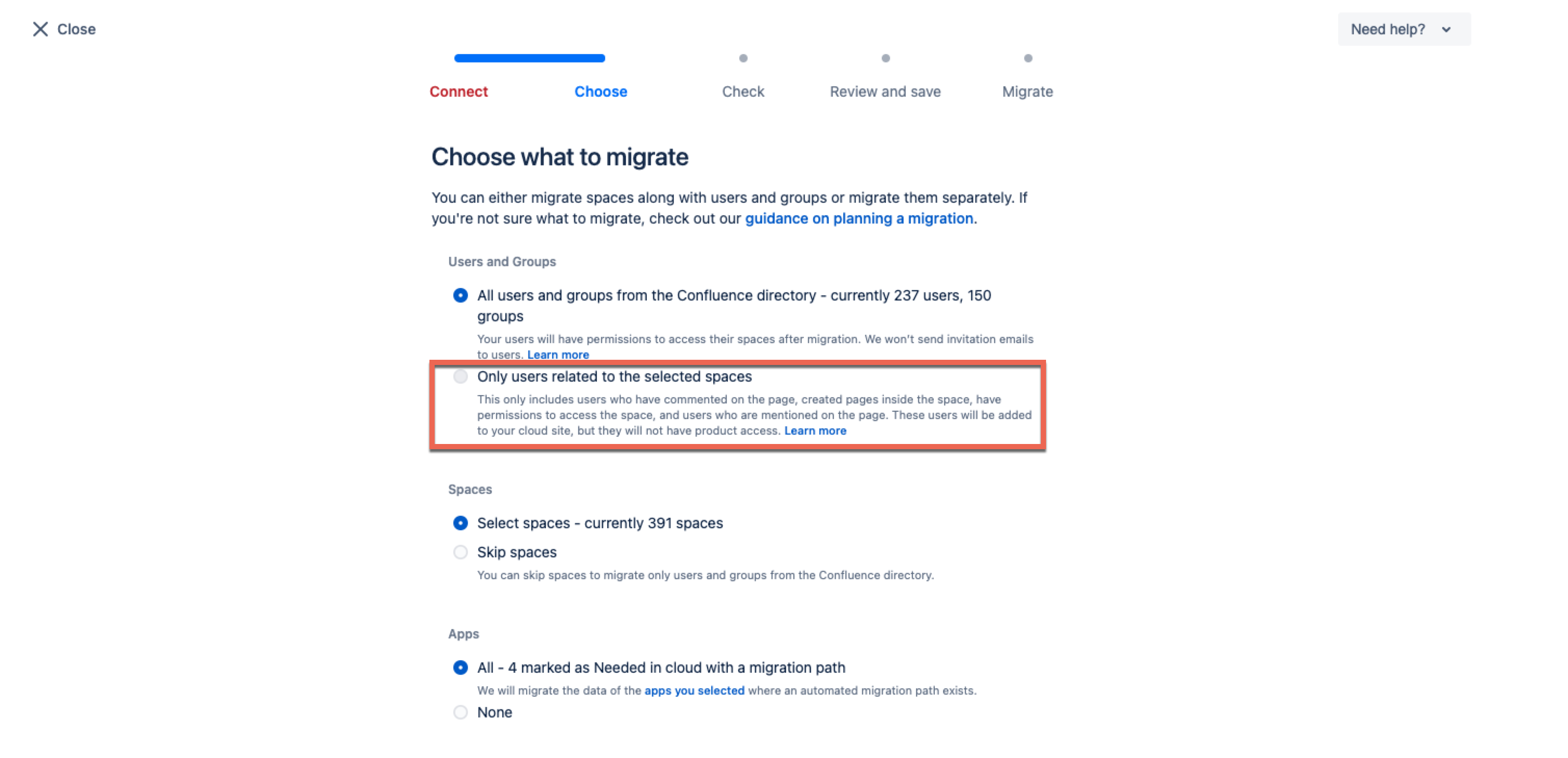 Under "Users and Groups", select "Only users related to the selected spaces" to avoid migrating too many users.