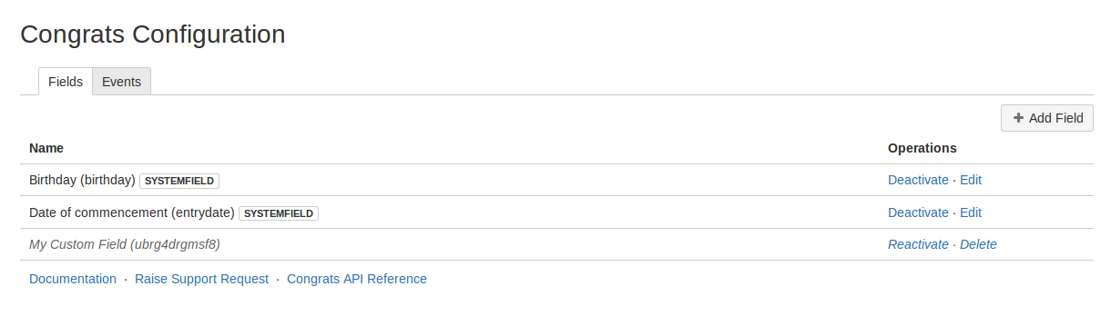 Fields are the occasions you are able to define. Birthday and date of commencement are already predefined, marked as Systemfields. You can