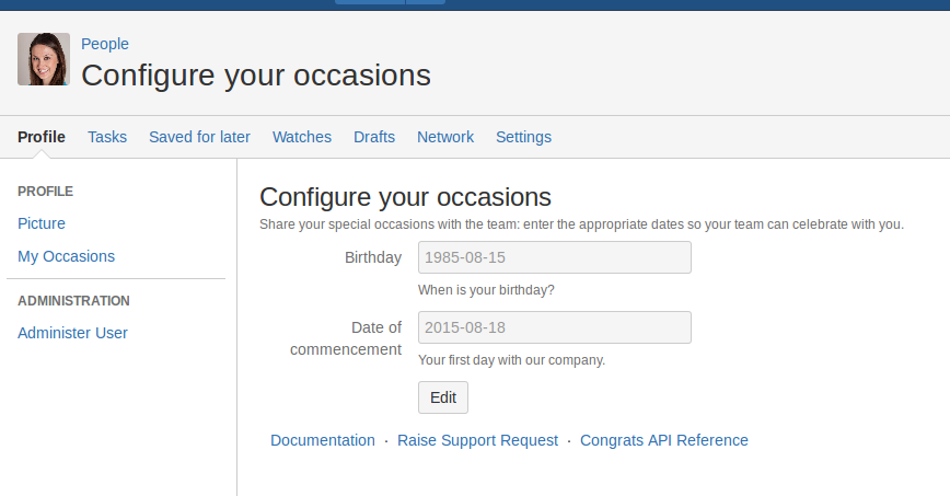 To display your special occasions within Congrats macro and give your team the chance to celebrate with you, you have to enter the important dates in your profile.