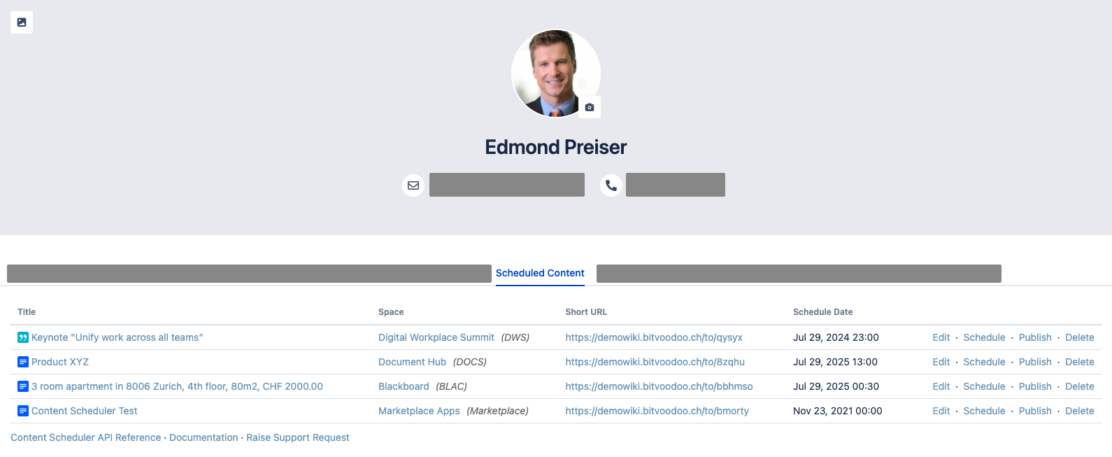| 5 | Save the content by clicking on "Update" in the editor. You will be redirected to the tab “Scheduled Content” of your user profile. See more info on the Content Scheduler overview page. |  |