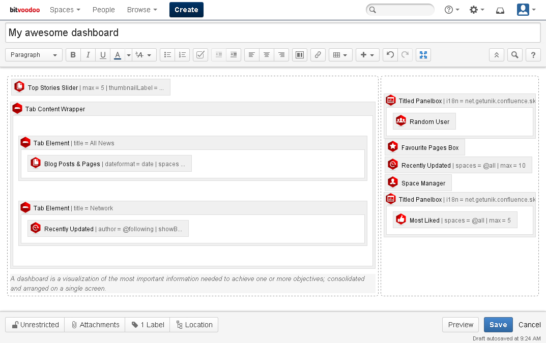 After you've finished your editing, just save your changes, go to the homepage of Confluence and see your newly created dashboard in action.