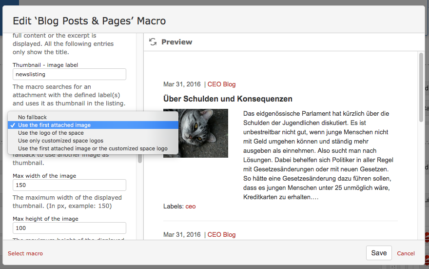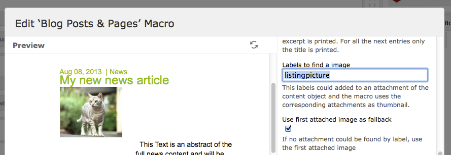 The following steps are only necessary if you have more than one picture attached to a blog post. If the "Blog Posts & Pages" or "Top Stories Slider" macro doesn't find any labelled pictures, it automatically uses the first image that was attached to the blog post.
