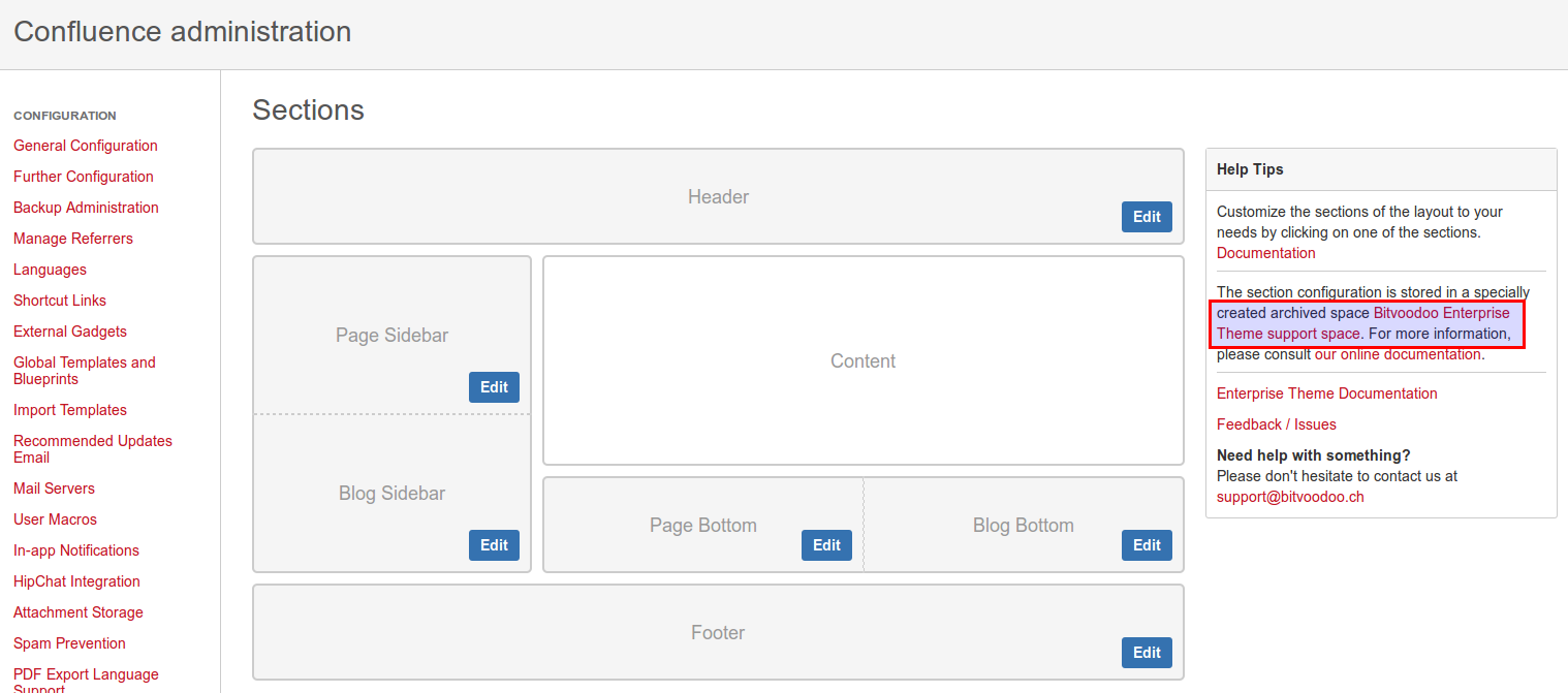 With non-standard Confluence user group configurations it is possible that viewing and/or editing custom sections or other content in the Bitvoodoo Enterprise Theme support space does not work properly. If you are receiving authorization errors when trying to edit sections or cannot see attachments / images of customized sections, then you will have to take a closer look at your user groups and permissions on the support space.