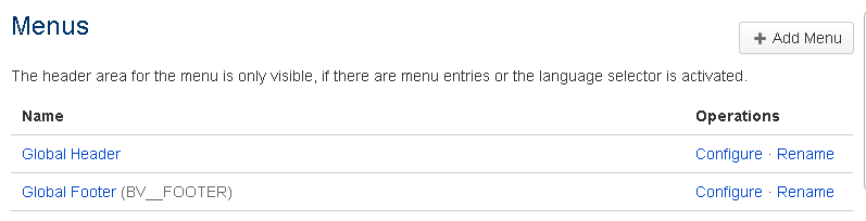 Select Menus under Enterprise Theme in the left-hand panel. This will list the two default menus for the header and the footer. It can also contain other menus that have been configured.