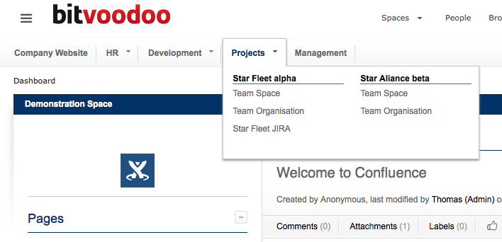 Group | - | grouping several items together. If this type is used on the top level of a menu, it acts as a drop-down menu. On the second menu level, groups are arranged horizontally and their children will be arranged underneath. In the example below, you see a header menu with the group Projects opened. The two child groups Star Fleet alpha and Star Alliance beta are arranged next to each other with their child items below them. ![]() |