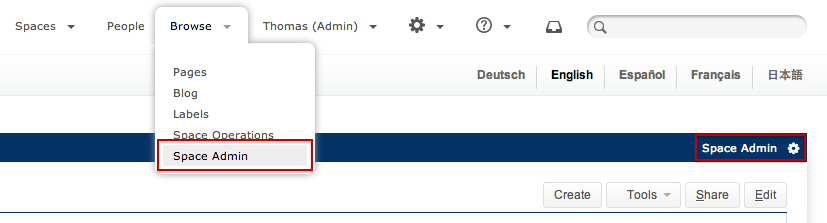 Finding the space administration is slightly different, depending on what space is currently active in a space.