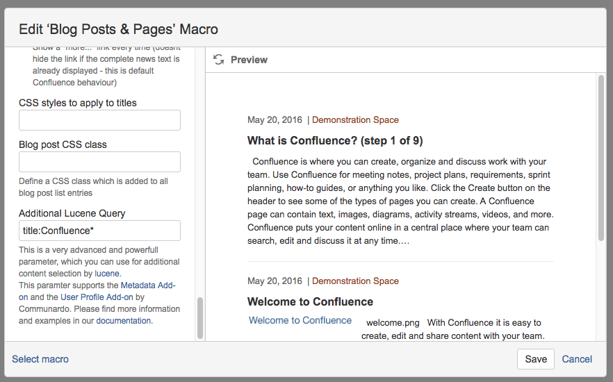 In this example we select all blogs with the word Confluence in the title. The whole syntax is documented in the article Confluence Search Syntax.