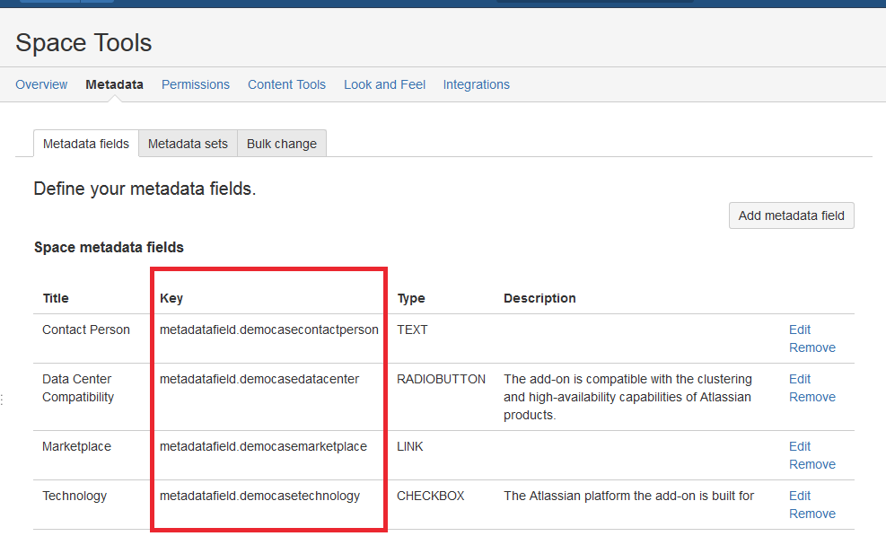 Confluence users can determine the key of metadata fields or sets by moving the mouse over the metadata set or field title within the metadata overview.