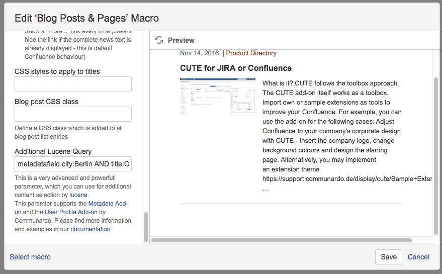 Some macros can use the metadata information within their macro configuration. These macros are implementing the Lucene query parameter of the news macros. You can use the parameter in these macros: