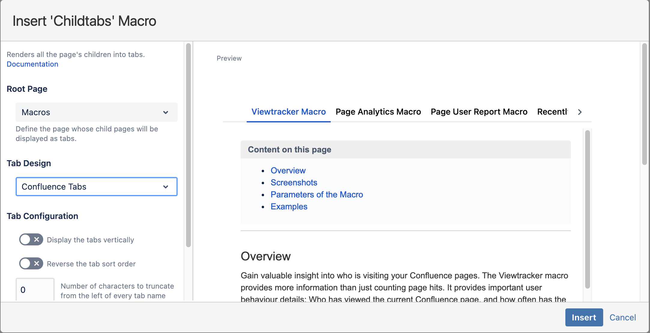 A preview appears, based on the children of the current page. To change the macro's setting, select the pen icon.