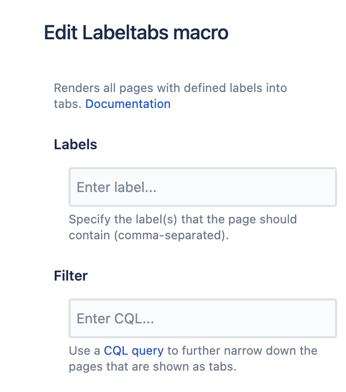 The pages "Localtab Macro" and "Confluence Macros" contain the label "marketing". To display these pages as tabs, add the Labeltabs macro and enter the label "marketing".