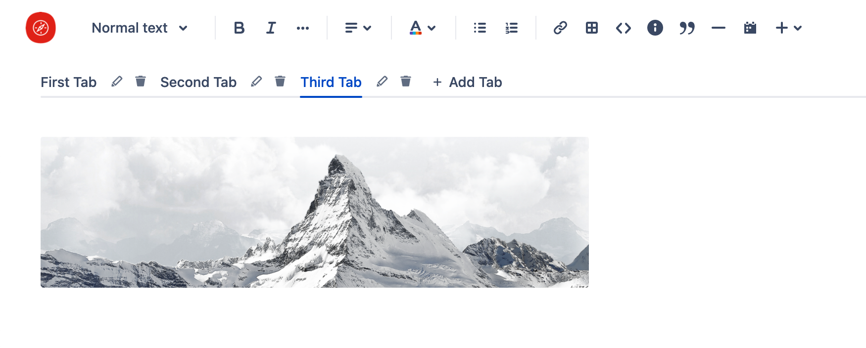 Insert tab content: Enter any content (text, images, macros like status, panels, etc.) the way you are used to in the Confluence Cloud editor.