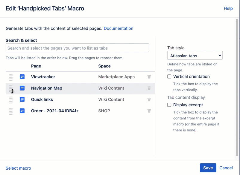 Handpicked Tabs Macro - search and select pages