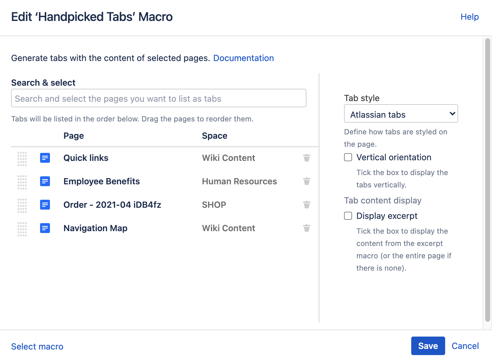 Display excerpt: Tick the box to display the content from the excerpt macro in the Handpicked Tab macro. If there is no excerpt, the entire page will be displayed.