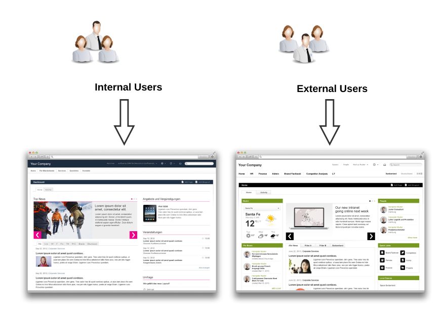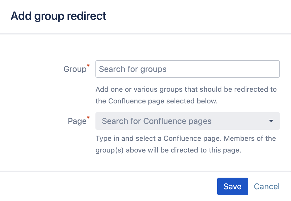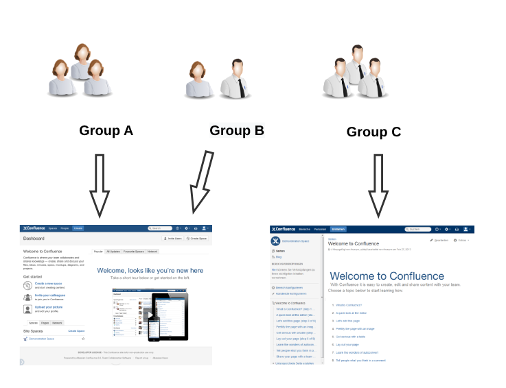 Using the Redirect app, administrators can assign unique homepages to several individual user groups. As soon as users access Confluence, they are redirected to a homepage that was set up for their user group. The destination of the redirect can be a page, a blog post or a space homepage.