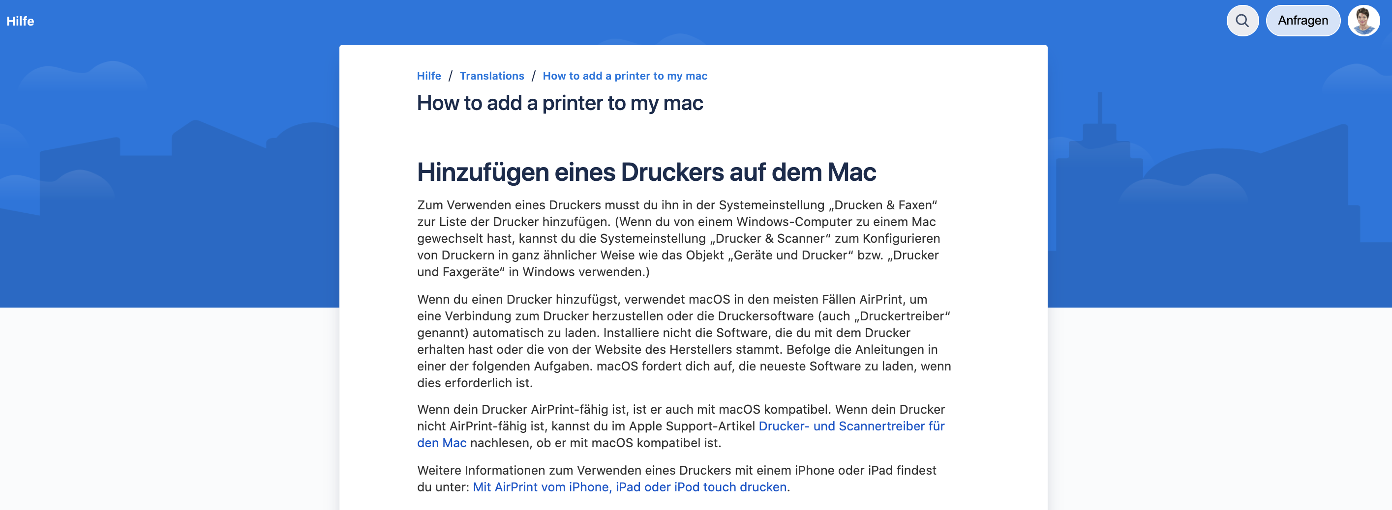 The suggested article "How to add a printer", when clicked, is opened in English in the JSM interface.