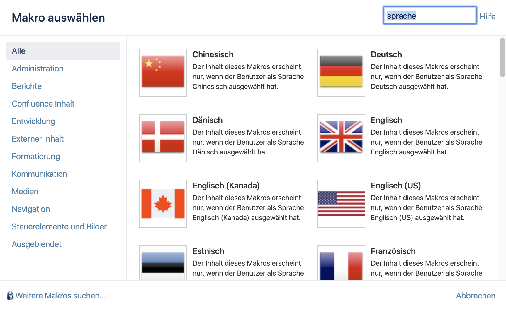Why this matters: If your Confluence is run in German, French or Spanish, you can look for language macros in your mother tongue:
