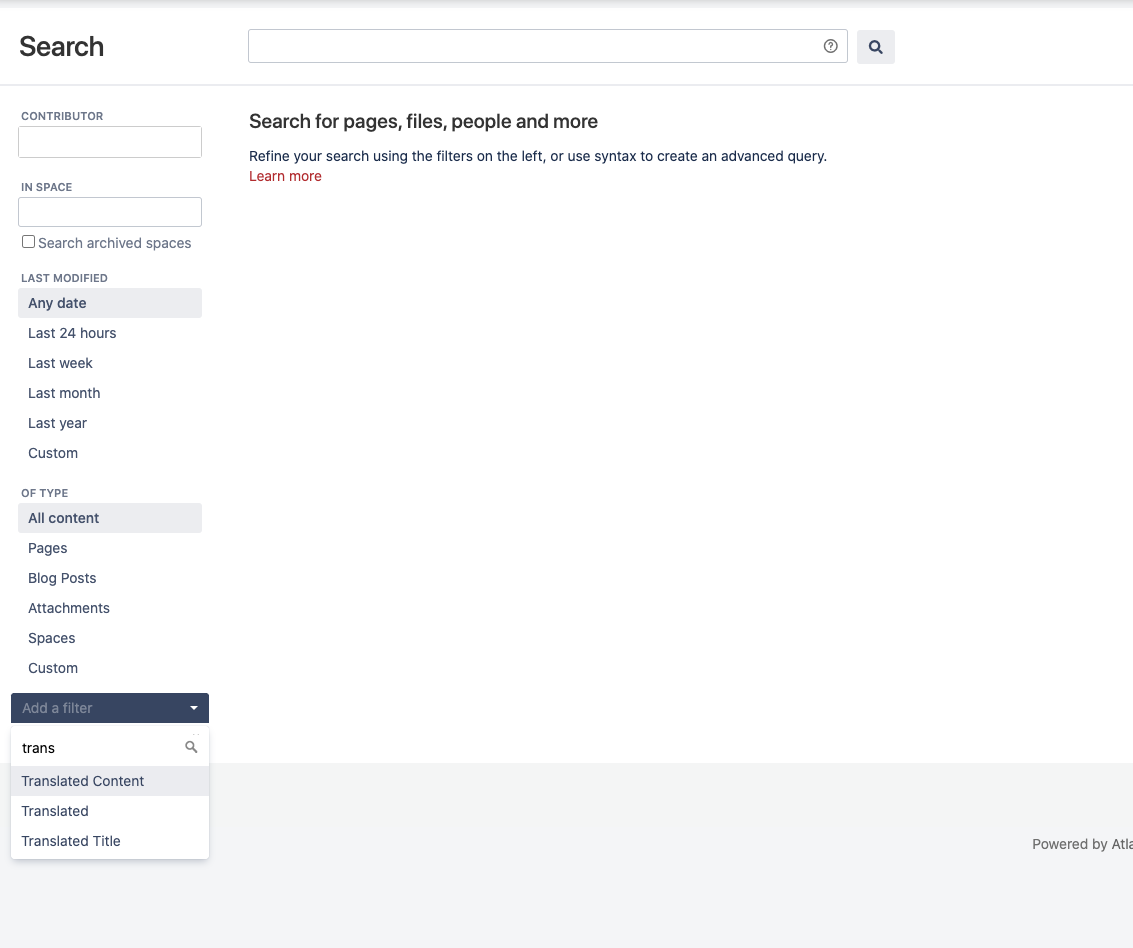 Starting with version 5.1, you can use Translation for Confluence's language attributes to search by language within your Confluence instance.
