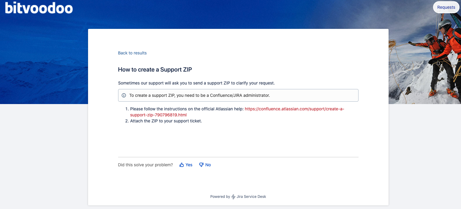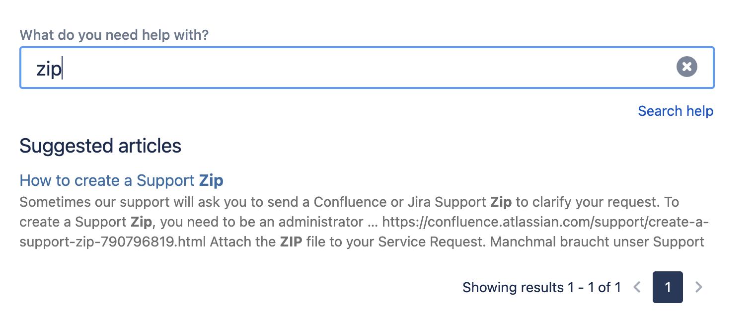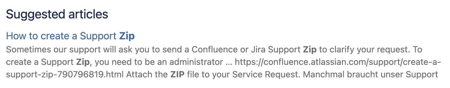 Let’s look at an example: The client or an agent is looking for "zip" within Jira Service Management. The suggested article title is "How to create a Support ZIP".
