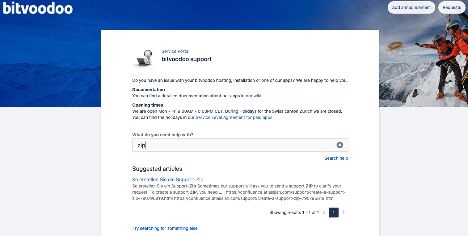 The same search as above is carried out with Confluence set to German. This will deliver the suggested article’s title in German: "So erstellen Sie ein Support-Zip"