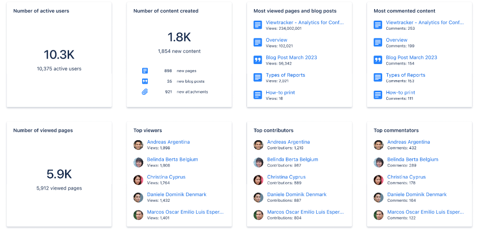 Track and compare the number of active users and views across pages, spaces, and attachments.