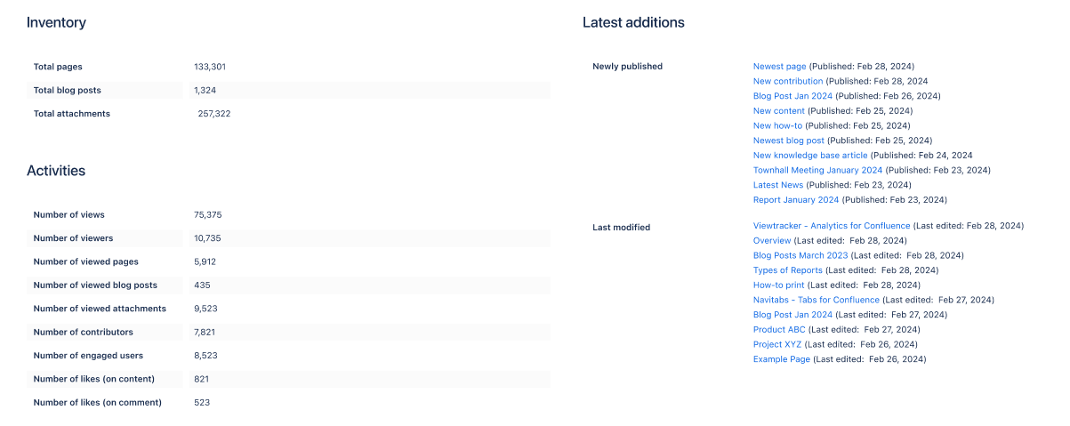 This report provides a comprehensive overview of your Confluence instance's activity and usage patterns.