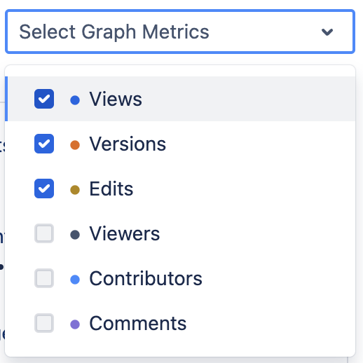 Below the graph, there is a drop-down menu listing the available metrics. By default, “Views”, “Versions” and “Edits” are selected.