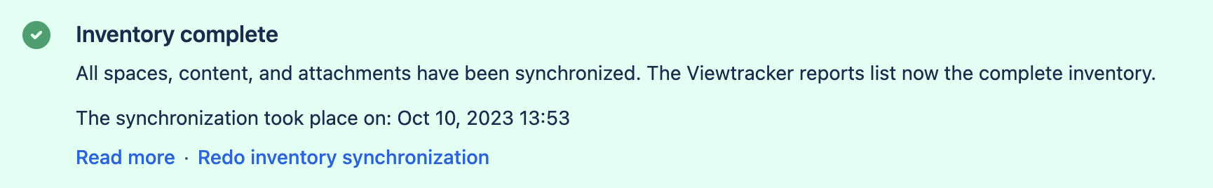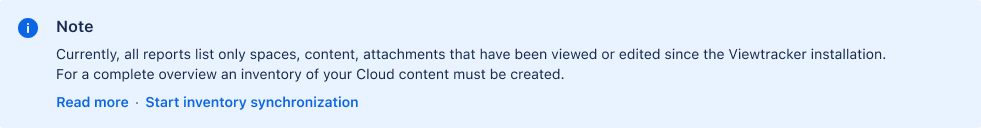 As a Confluence administrator, you can perform a content synchronization so that information about the entire Confluence content inventory is shared with Viewtracker. After that, all content will be listed in the Viewtracker reports, regardless of whether there has been any activity since the app was installed.