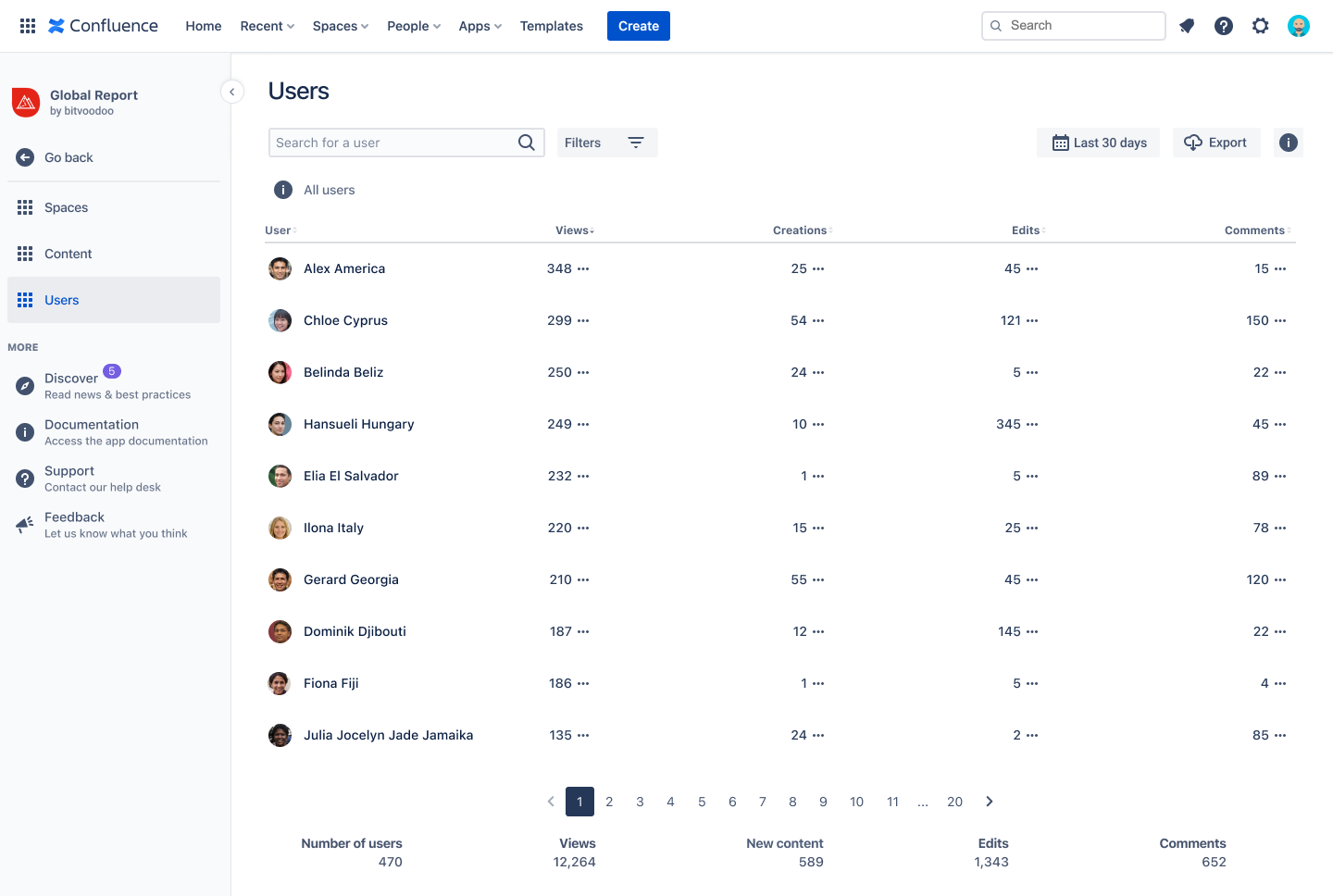 The main report is a table with the columns “User”, “Views”, “Creations”, “Edits” and “Comments”.
