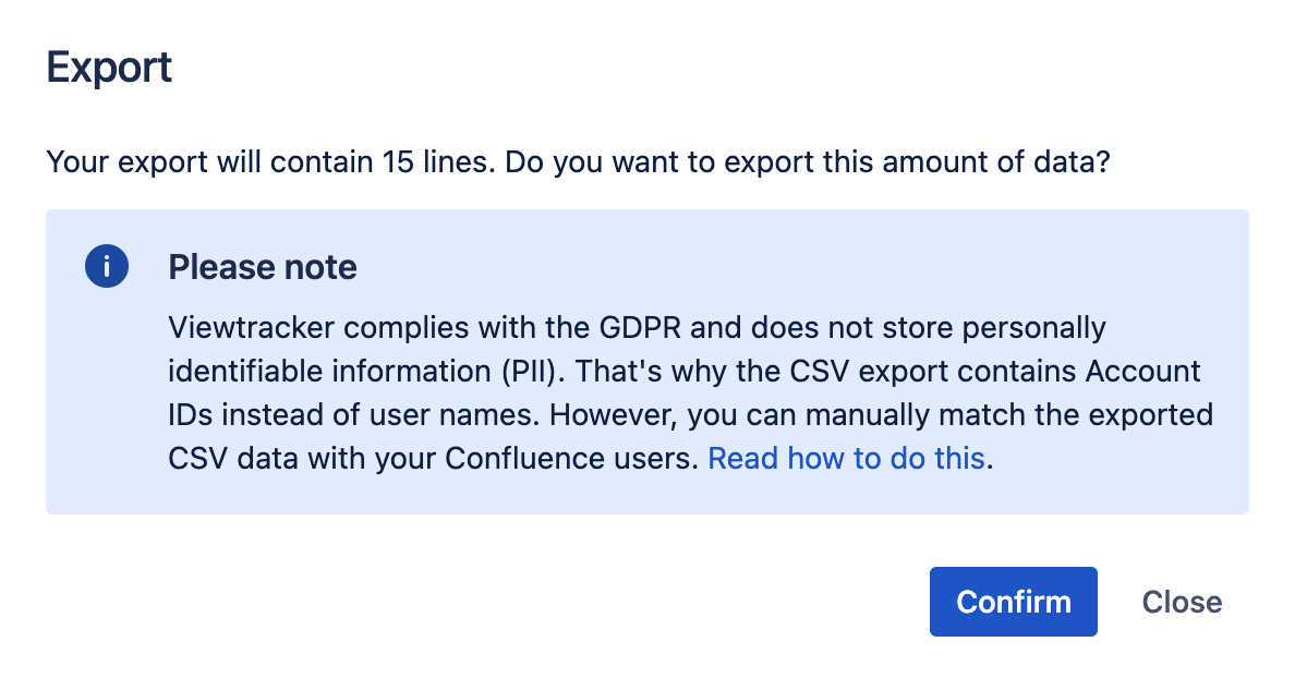 The CSV contains the individual views, creations, edits or comments and consists of "Content Title", “Space Key” and "Date and Time".