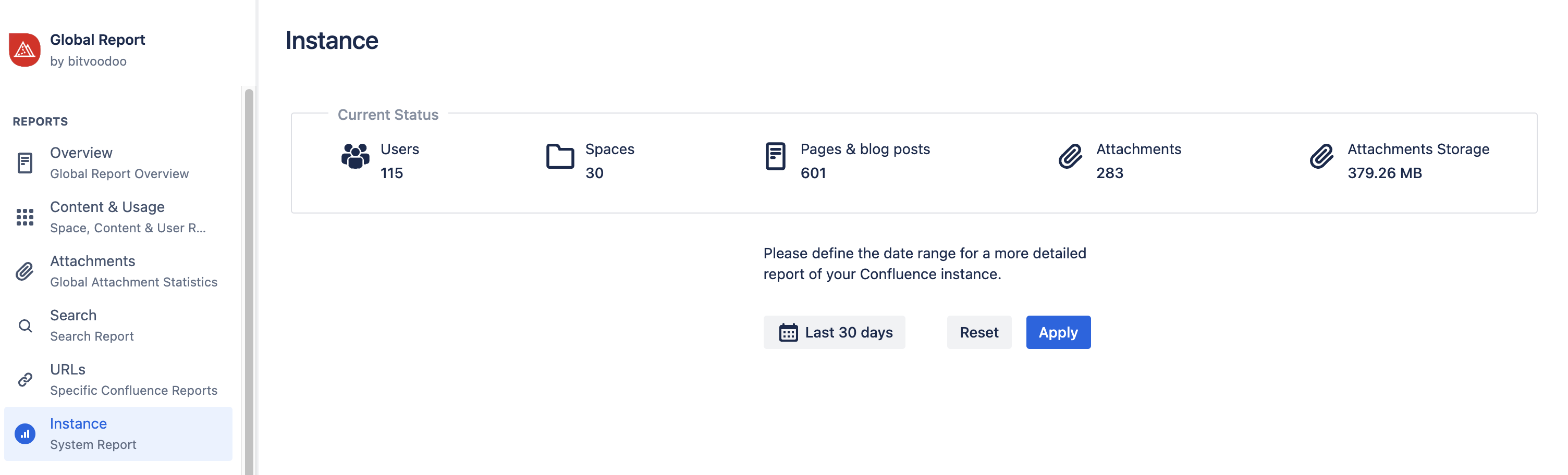 Discover how your Confluence instance is developing (includes user count, attachment storage, etc.)