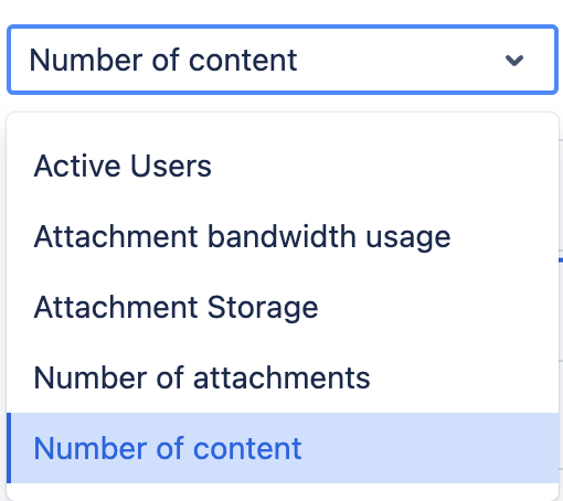 The default selection is “Storage increase”: The top 10 spaces in the set date range for “most attachments” (according to their file size) are listed here.