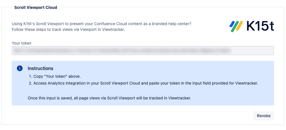 You can revoke the token at any point if it is compromised. This will deactivate the existing token and generate a new one. If you revoke the token, the views via Scroll Viewport will no longer be tracked in Viewtracker. If you want to have the views counted again, you must replace the previous token in Scroll Viewport with the new one.
