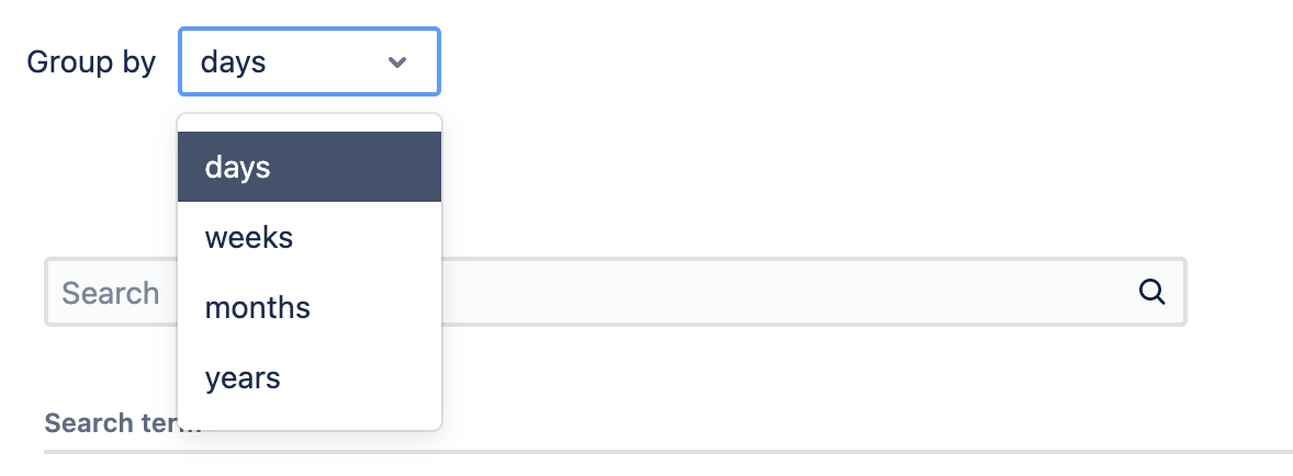 You can group the metrics in the graph using “Group by” days (default), weeks, months, or years.