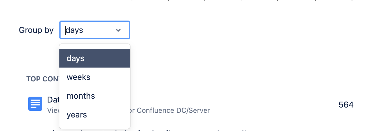 Top content: The top 10 pages or blog posts in this space, sorted by the number of views. Click on any title to the Content Report of the page.