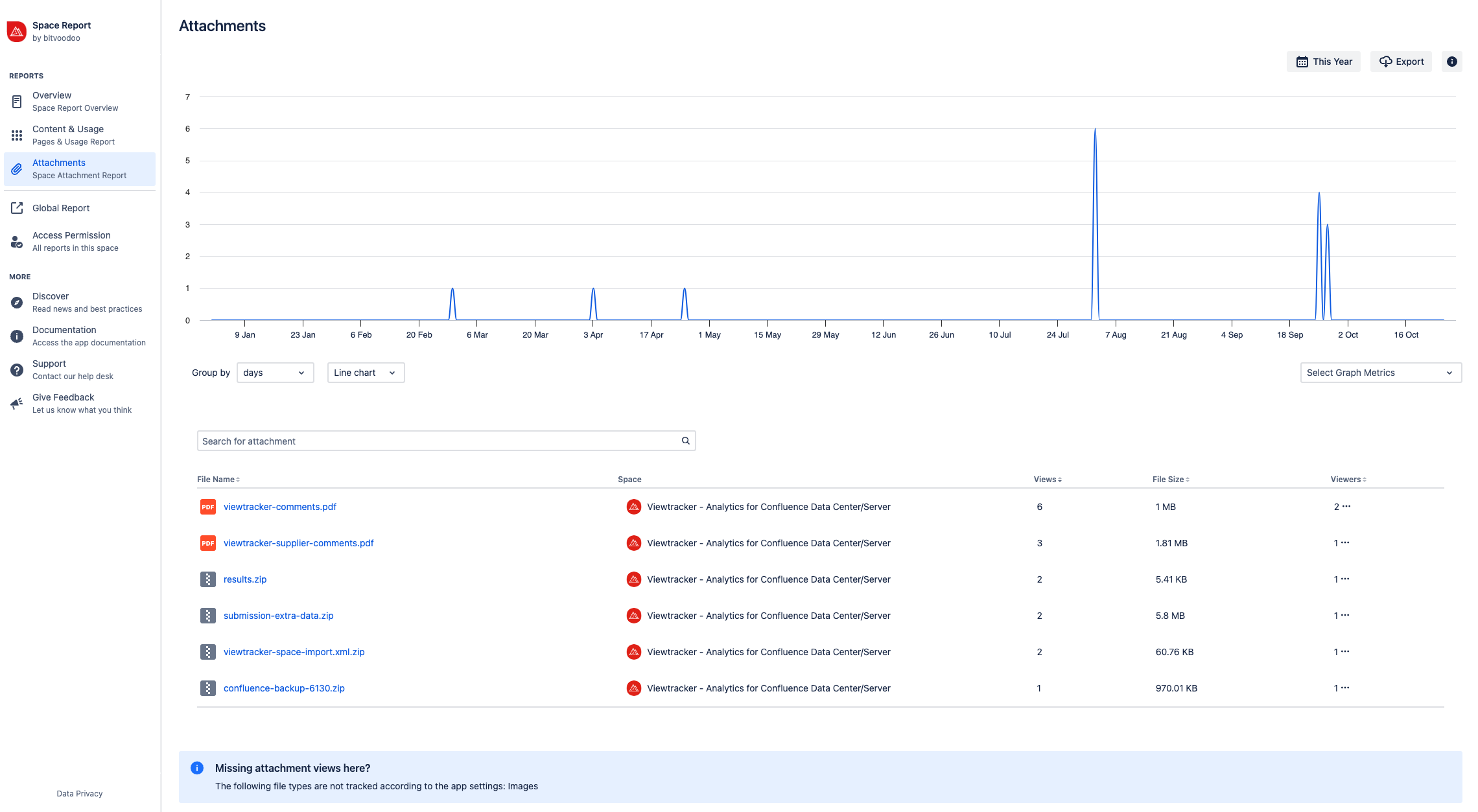 See how many people have viewed or interacted with a specific space and the attachments it contains. Apply powerful filters for the most relevant metrics.