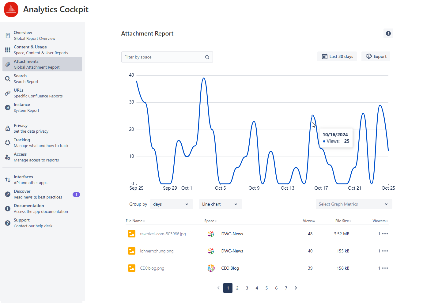 Viewtracker measures attachment views and displays this information in various places throughout your Confluence instance. You can promote relevant content & remove unused attachments.