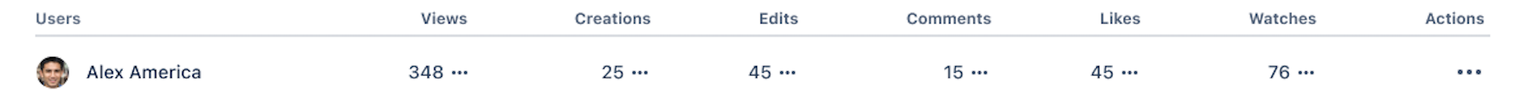 Full Name, Views Total, Creates Total, Edits Total, Comments Total, Likes Total, Watches Total