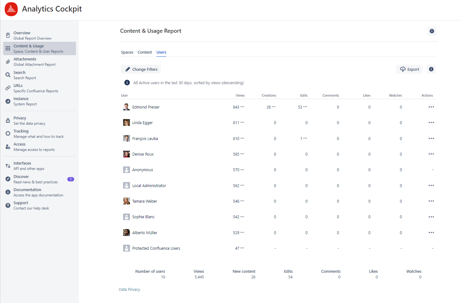 ⚙ → Analytics Cockpit (visible to Confluence Administrators only) or