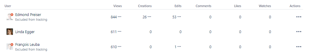 above their profile picture and the addition “Excluded from tracking views”. Their views are not counted. However, their other actions (creations, edits, etc.) still appear in the table. This is because these actions are publicly available to any user via the page history/page information.