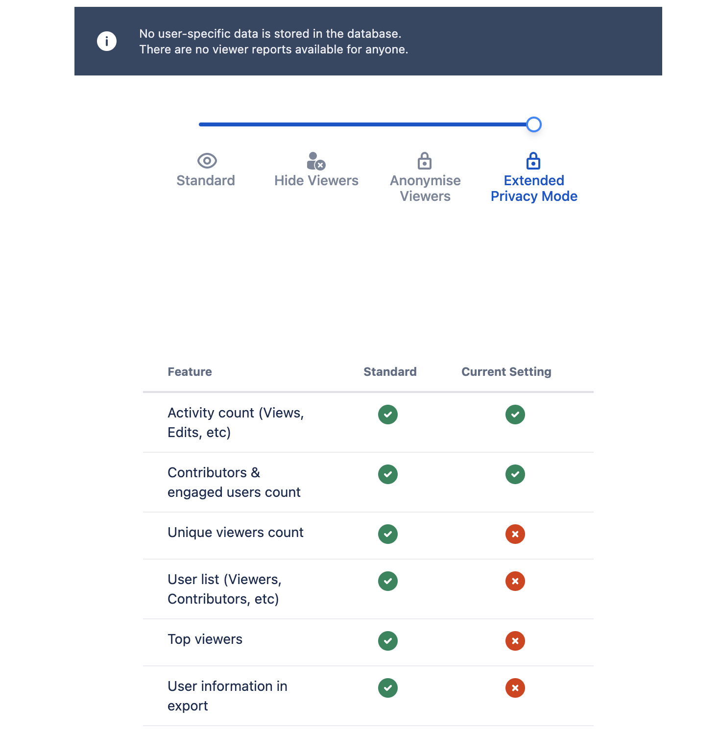 If the privacy mode is ever switched to a different mode, users who viewed content in Extended Privacy Mode will appear as Protected Confluence Users.
