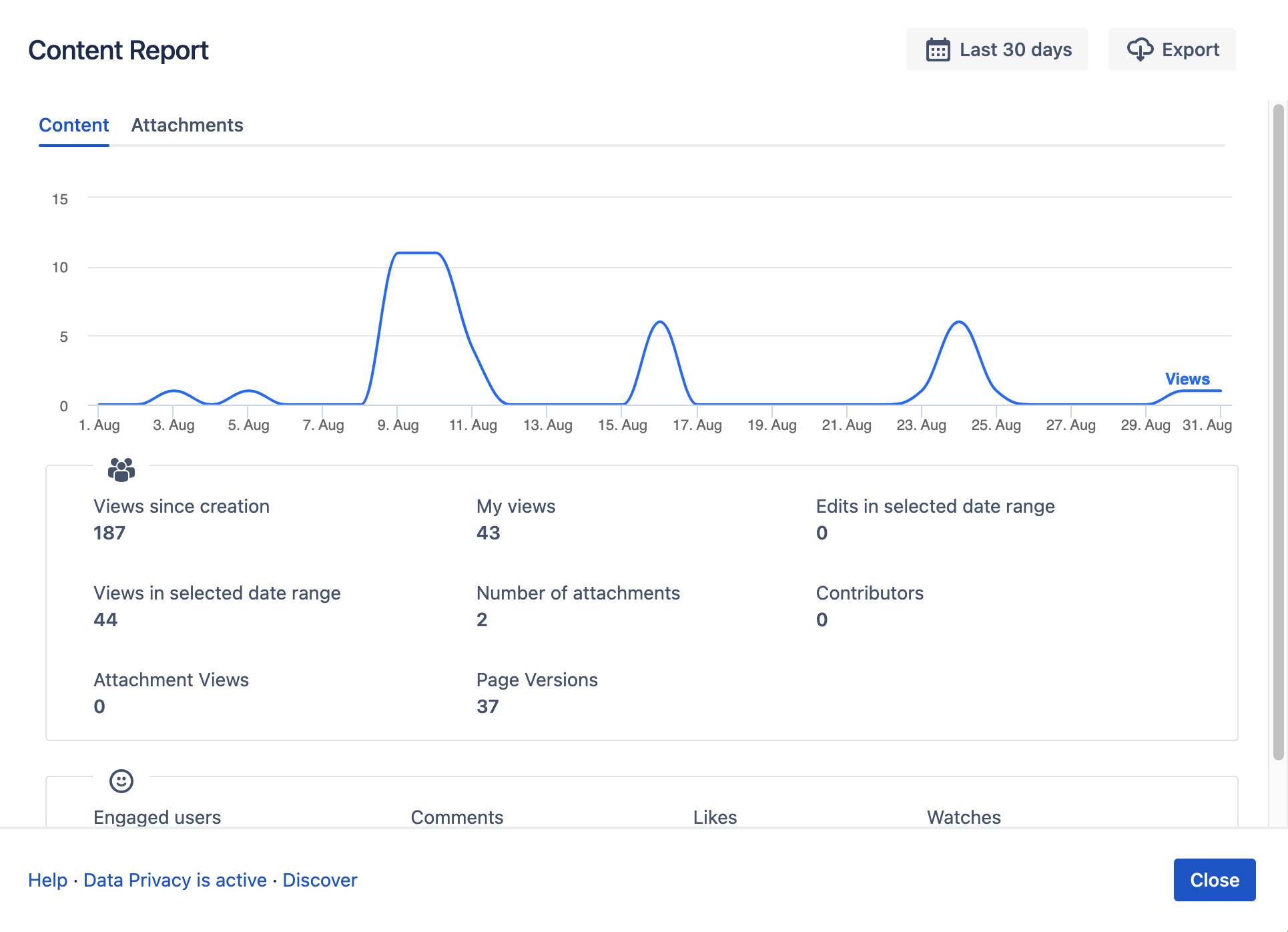 The Content Report will show the number of views, the engaged users, and non-user-specific information without displaying the tab "Viewers" or the Viewers.