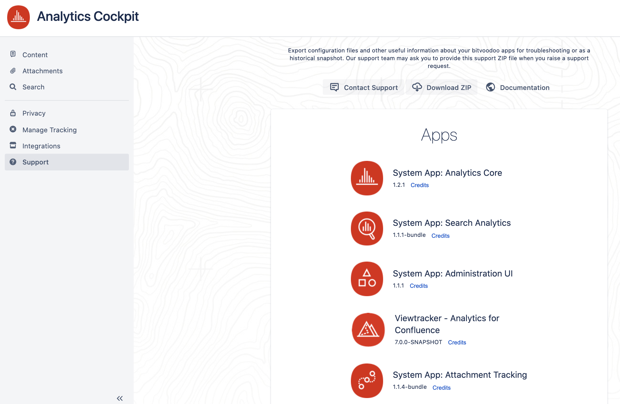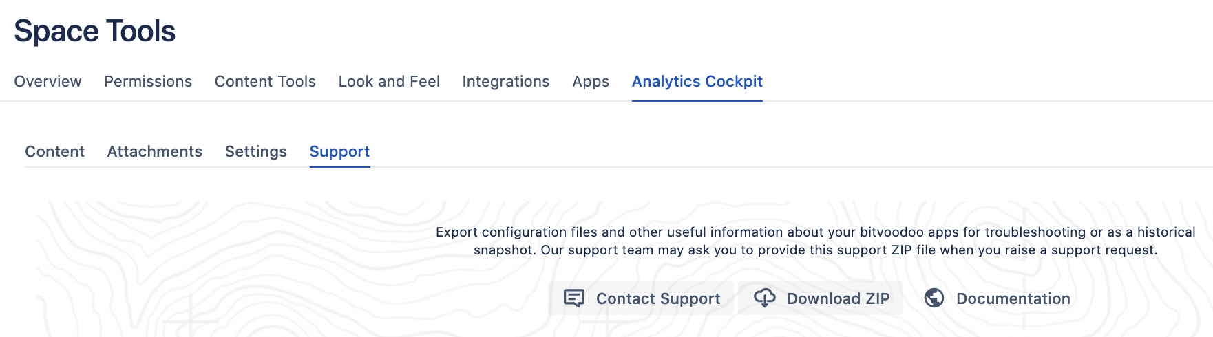 Confluence Administrators can create the Viewtracker Support ZIP file by accessing ⚙ → Analytics Cockpit → Support and clicking the button "Download ZIP".