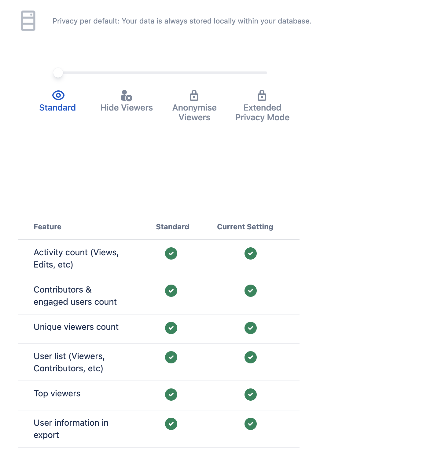 This is the default mode when installing Viewtracker for the first time. It collects most information about your Confluence users, including their full name and profile picture. If this is not the desired setting, administrators can choose a more appropriate setting in the Data Privacy.