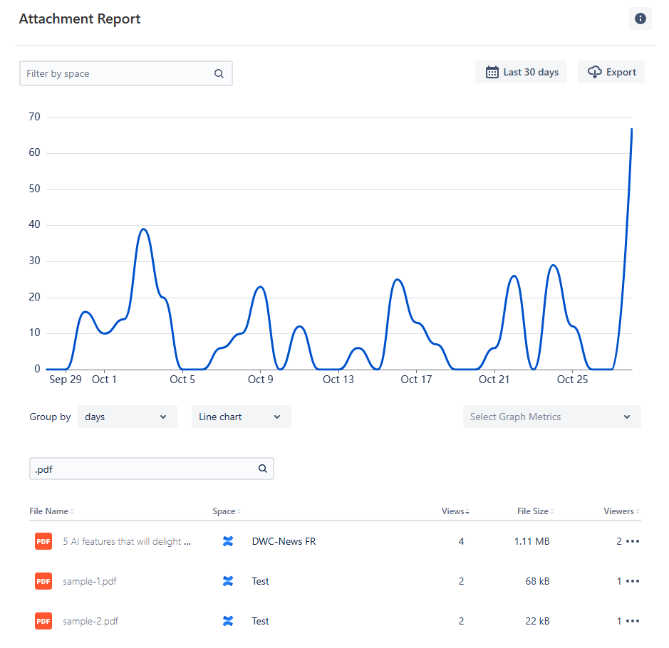 If enabled in settings, Viewtracker will display the view and download counts for attachments. This information appears in several areas within Confluence, as detailed below: